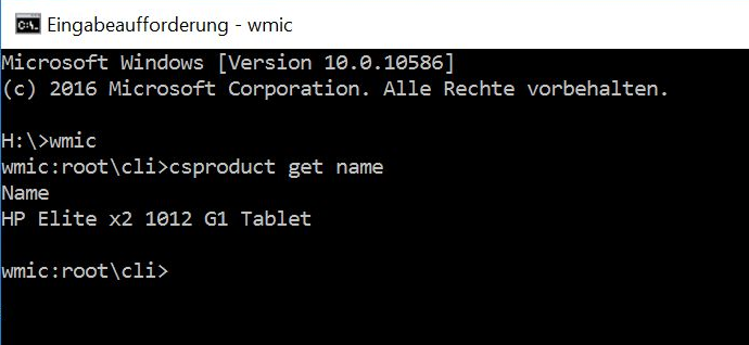 Den Modellnamen erhält man durch eine WMI Abfrage. Dazu öffnet man eine Eingabeaufforderung und gibt “wmic” ein. Danach erhält man durch die Eingabe von “csproduct get name” den passenden Namen.