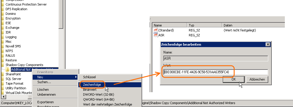 Nun kann man bei diesem Schlüssel eine neue Zeichenfolge mit dem Namen “ASR” und dem Wert “{BE000CBE-11FE-4426-9C58-531AA6355FC4}” erstellen.