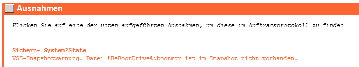 Bei einer neuen Backup Exec Installation hatte ich folgende Fehlermeldung bei einem Backup mit ausgewältem “Systemstatus”: “VSS-Snapshotwarnung. Datei %BeBootDrive%\bootmgr ist im Snapshot nicht vorhanden.”