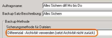 Um herauszufinden, ob eine Datei gesichert werden muss, verwendet unsere Backuplösung das sogenannte Archivbit. Windows setzt bei allen neuen oder geänderten Dateien ein solches Archivbit. Bei einer Vollsicherung am Wochenende wird dieses Archivbit von der Backupsoftware zurückgesetzt. Diese Dateien werden dann unter der Woche vom differentiellen Backup nicht mehr gesichert. Bei allen Dateien, die aber seit dem Wochenende neu angelegt oder geändert wurden, setzt Windows wieder das Archivbit. Diese so gekennzeichneten Dateien werden nun beim differentiellen Backup gesichert, das Archivbit aber nicht zurückgesetzt. Damit werden sie (im Gegensatz zum inkrementellen Backup, bei dem das Archivbit zurückgesetzt wird) jeden Tag unter der Woche erneut gesichert, auch wenn sie bereits am Montag erstellt wurden (bis bei der nächsten Vollsicherung wieder alle Archivbits zurückgesetzt werden).
