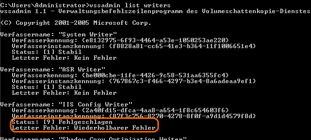 Nachdem die Dienste “Anwendungshost-Hilfsdienst” und “IIS-Verwaltungsdienst” neu gestartet wurden, liefert nun auch wieder ein “vssadmin list writers” alle Writerabfragen ohne Fehler zurück. Somit sollte also auch das nächste Backup wieder funktionieren.