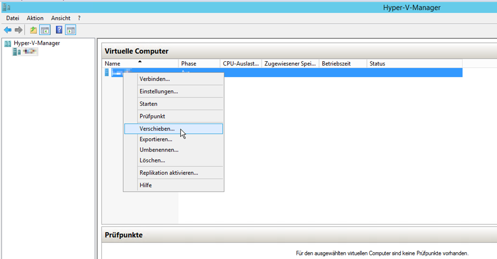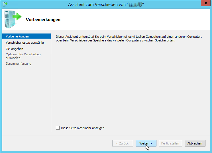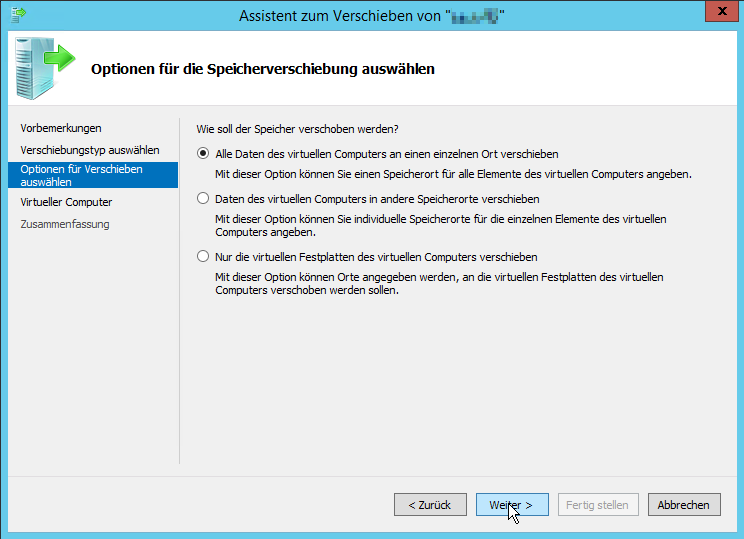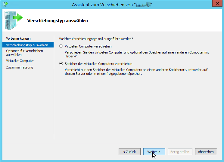 In der nächsten Auswahl muss man “Speicher des virtuellen Computers verschieben” auswählen, da das Ziel ja auf dem gleichen Computer liegt.