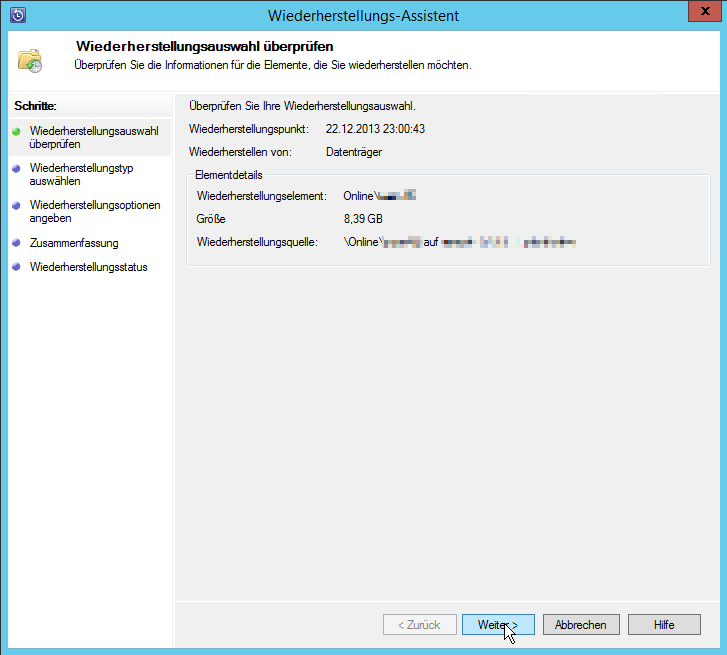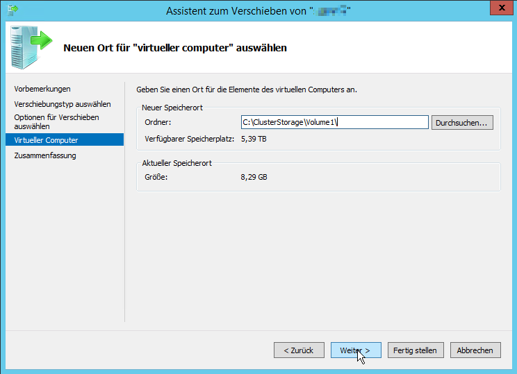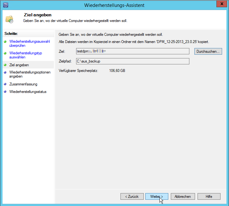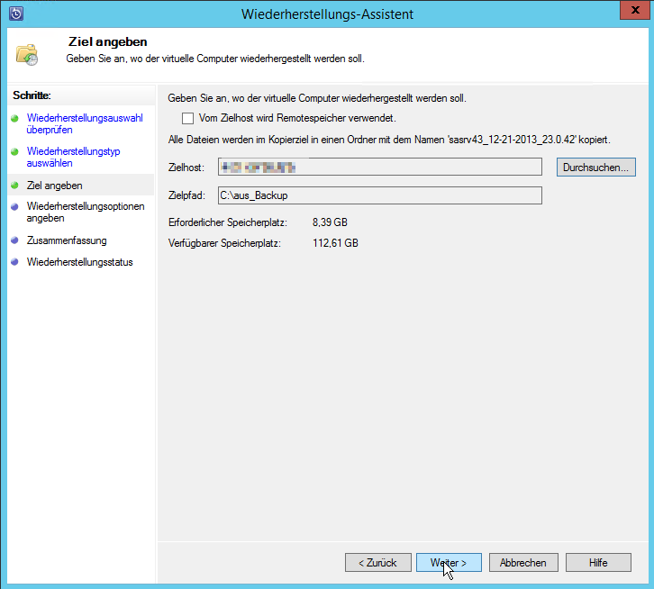 Nun kann man ein Wiederherstellungsziel angeben. Eine direkte Wiederherstellung auf das CSV hat bei mir zu einer Fehlermeldung beim Start der virtuellen Maschine geführt. Daher habe ich einen Unterordner ausserhalb des CSV auf dem Clusternode mit der Witness Partition erstellt.