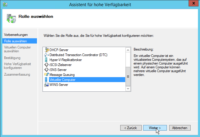 Nun ist die Maschine zwar im CSV gespeichert, aber noch nicht hochverfügbar. Um das auch noch zu erreichen, muss man im Failovercluster-Manager unter Rollen “Rolle konfigurieren” auswählen und “Virtueller Computer” auswählen.