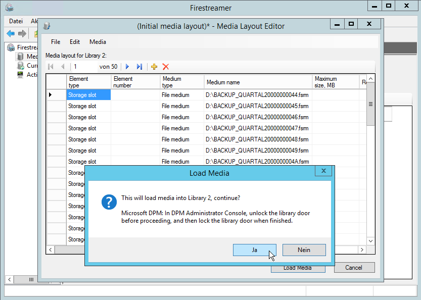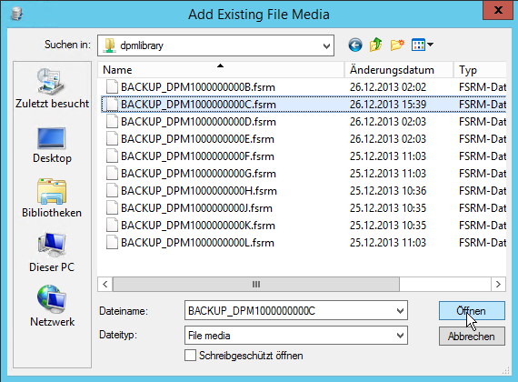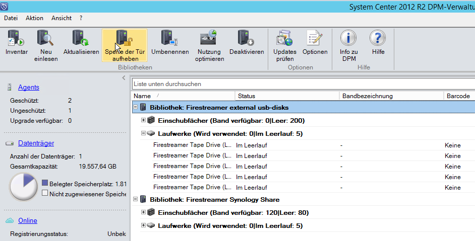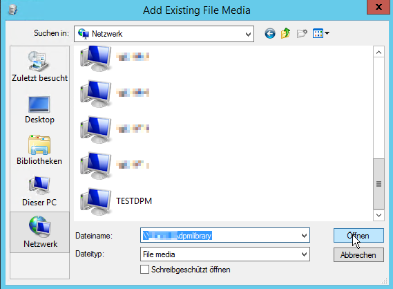 Nun wollte ich also testen, ob ich ein Backup aus so einem virtuellen Tape wiederherstellen könnte, wenn tatsächlich die Server und der DPM Server gleichzeitig ausfallen würden. Dazu habe ich in einer virtuellen Maschine nochmals einen DPM Server und auch die virtuelle Library Firestreamer installiert. Auf dem “richtigen” DPM wurde dann die Library deaktiviert, damit nicht zwei Server gleichzeitig auf die Netzwerkfreigabe zugreifen können.