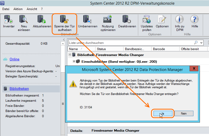 Nun muss man das Band in DPM einlesen. Dazu muss die Türe der virtuellen Tape-Library entriegelt, das Band eingelesen und die Tür wieder verriegelt werden.