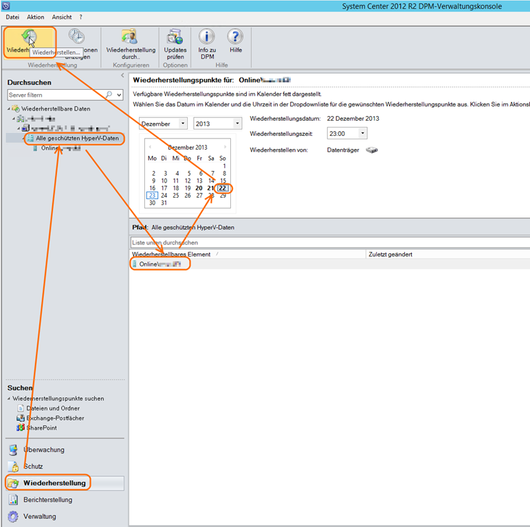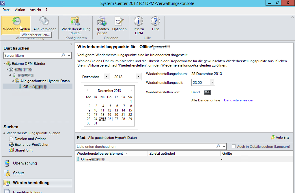 Unter “Wiederherstellen” wird nun der wiederherzustellende virtuelle Server angezeigt. Man kann ihn auswählen und wieder herstellen. Man kann nur auf Maschinen mit installiertem DPM Agent wiederherstellen. Nur für diesen Test habe ich keine neuen Agents installiert und die virtuelle Maschine lokal wiederhergestellt.