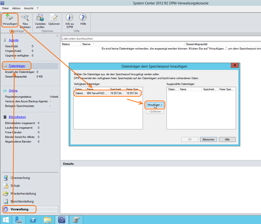 Als erstes muss man über “Verwaltung” –> “Datenträger” –> “Hinzufügen” einen Datenträger für die Backups hinzufügen. Auf diesem Datenträger sollten noch keine Volumes angelegt sein.