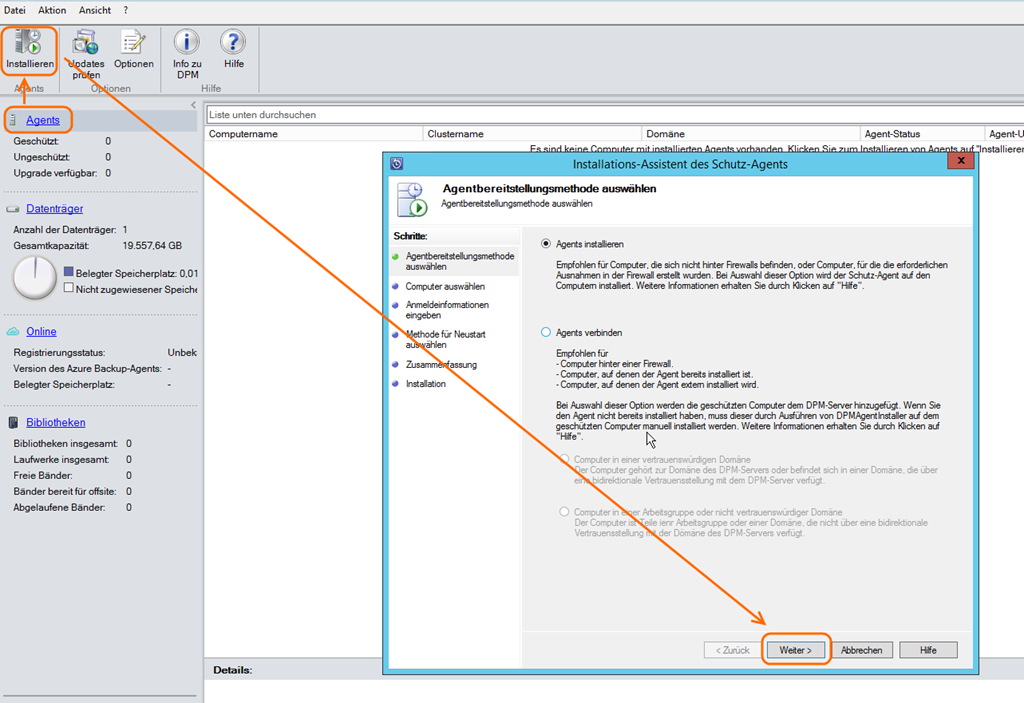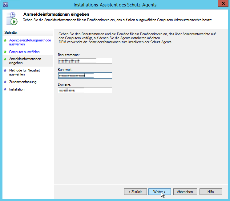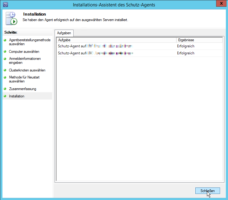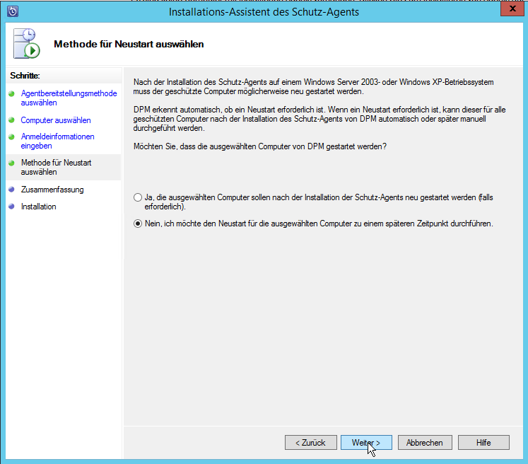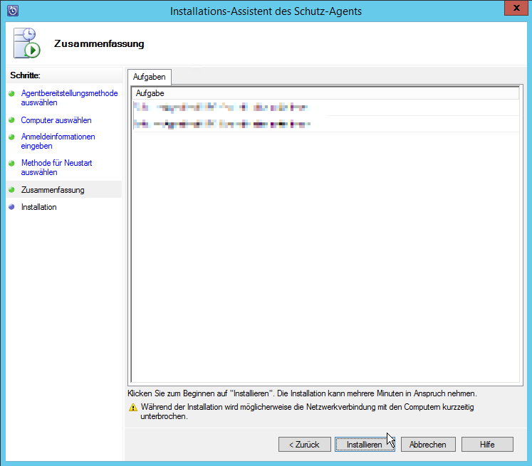 Nun kann man einen Agent auf den gewünschten Servern installieren. Gemäss KB2621989 soll man für diesen Vorgang die Firewall (auf dem Server, auf den der Agent installiert werden soll) deaktivieren und danach wieder aktivieren, oder man erstellt eine Firewallregel.