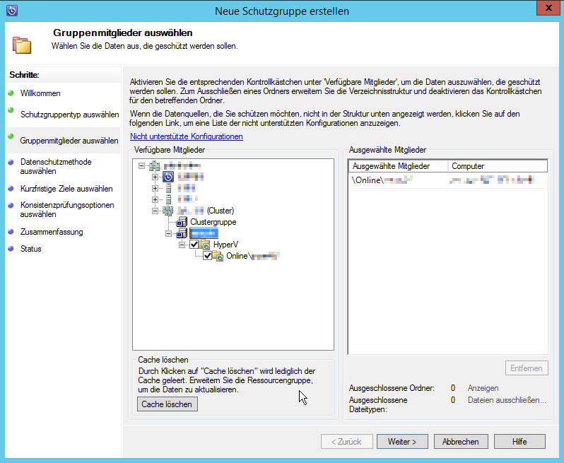 Nun kann man die Ressourcen auswählen. Hier wurde eine virtuelle Hyper-V Maschine ausgewählt, die von “aussen” gesichert wird, also selber gar keinen Agent installiert hat.