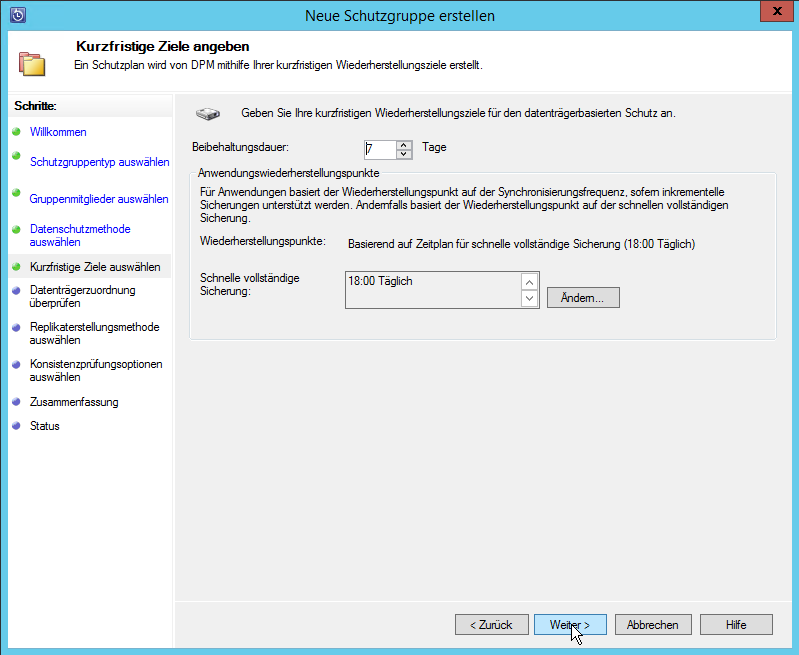 Unter Beibehaltungsdauer kann man angeben, wie lange zurück man aus der Sicherung wiederherstellen möchte.