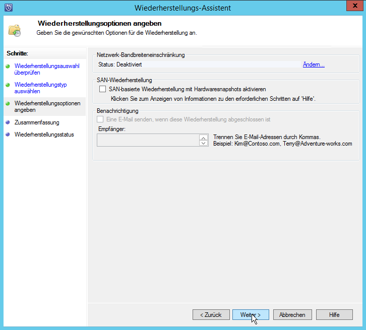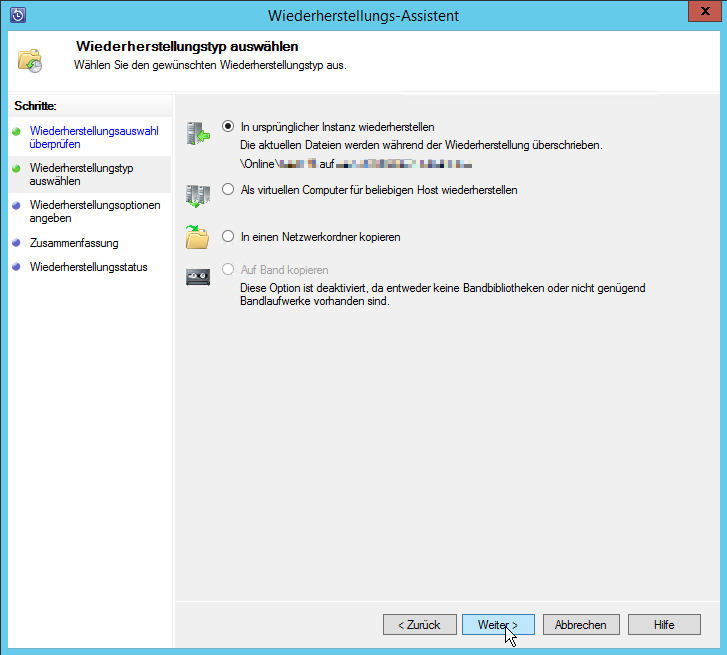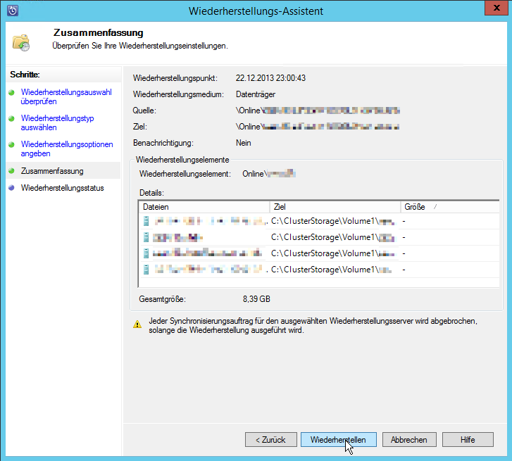 Wenn man die Wiederherstellung nun gleich wie oben beschrieben durchführt, erhält man die folgende Fehlermeldung.