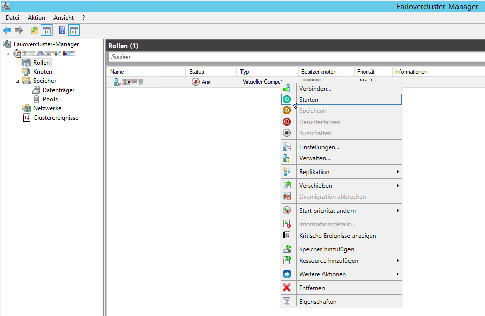Nach der Wiederherstellung ist die virtuelle Maschine heruntergefahren. Man kann sie aber problemlos im Failovercluster-Manager starten.