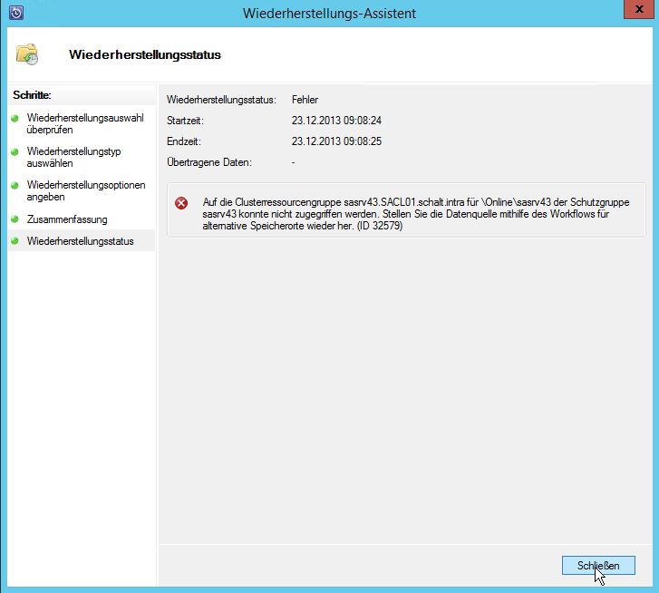Auf die Clusterressourcengruppe … für \Online\… der Schutzgruppe … konnte nicht zugegriffen werden. Stellen Sie die Datenquelle mithilfe des Workflows für alternative Speicherorte wieder her. (ID 32579).