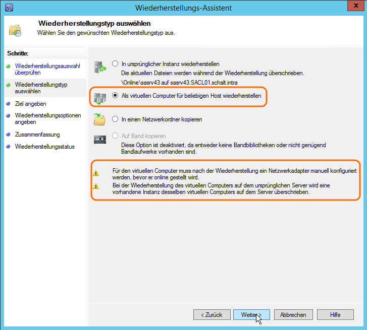 Also habe ich es mit dem zweiten Wiederherstellungstyp versucht. Unten wird darauf hingewiesen, dass man den Netzwerkadapter für die virtuelle Maschine nach der Wiederherstellung konfigurieren muss.