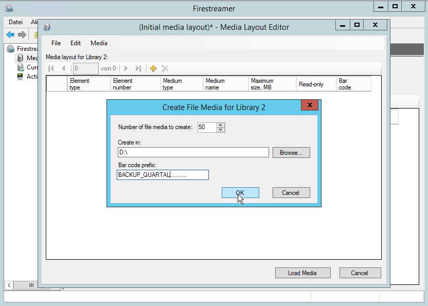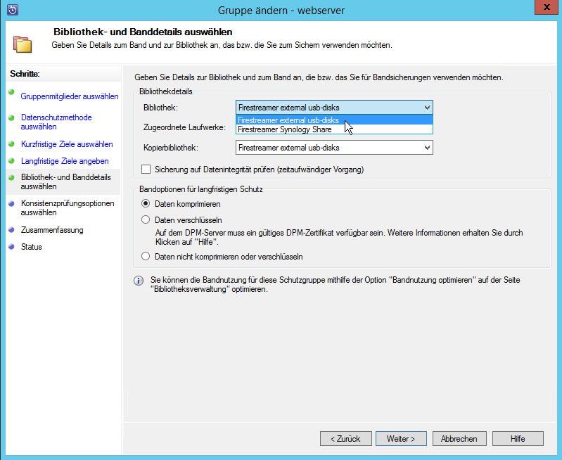 Der DPM Server steht in einem anderen Schulhaus als die Server und ist über eine Glasfaserverbindung mit den Servern verbunden. Grundsätzlich sollten also bei einem Desasterfall die Backups sicher sein. Trotzdem wollte ich testen, was passieren würde, wenn wir in einem “Worst Case” die Server und den DPM Server verlieren würden. Aus diesem Grund setzen wir auch noch eine Langzeitarchivierung auf virtuelle Bänder ein. Aus Kosten- und Performancegründen wollte ich keine physikalische Tape-Library einsetzen. Mit Firestreamer kann man virtuelle Tape-Libraries simmulieren. So kann man Backups statt auf Band auch auf externe USB-Disks oder sogar Netzwerkfreigaben (in nochmals einem anderen Schulhaus) sichern.