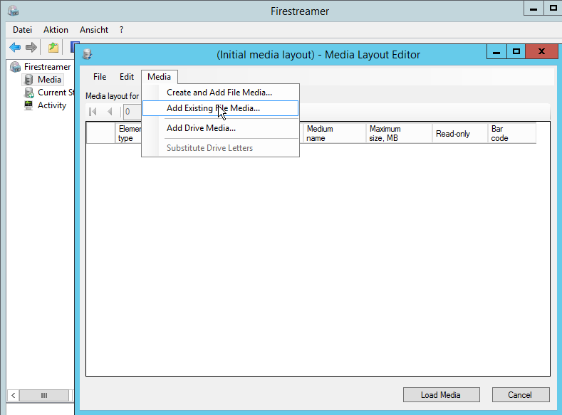 Wenn man nun auf “Load Media” klickt, meldet Firestreamer, dass man in DPM die “Bibliothekstüre entriegeln” muss.