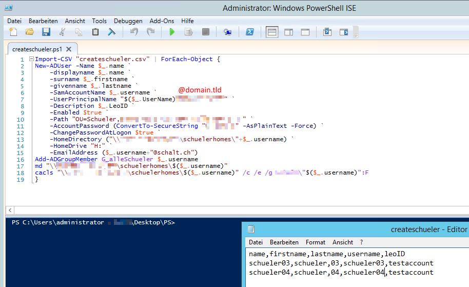 Manuell die ID bei all diesen Schüler/-innen nachzutragen, bedeutet wahrscheinlich mehrere Tage Arbeit und ist dann auch noch fehleranfällig. Powershell bietet mit Set-ADUser eine Möglichkeit, die Benutzeraccounts nachträglich automatisiert zu bearbeiten. Man benötigt also eine passende CSV-Datei mit den Lehrerofficeschlüsseln und ein Skript.