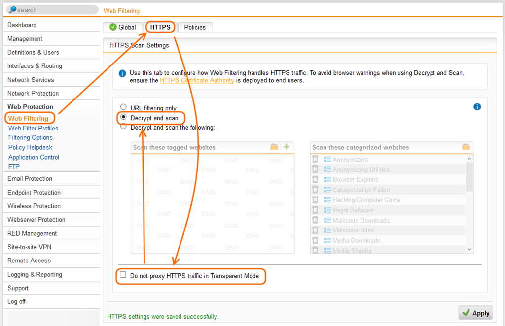 Um die https Filterung zu aktivieren, entfernt man unter “Web Protection” –> “Web Filtering” –> Registerkarte “HTTPS” das Häklein bei “Do not proxy HTTPS traffic in Transparent Mode” und wählt “Decrypt and scan”.