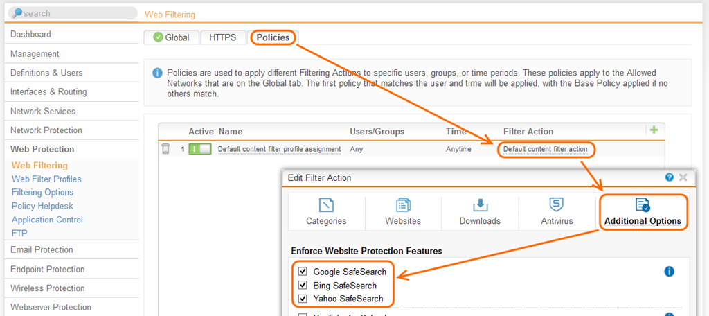 Damit wird nun der SSL Verkehr aufgebrochen und gescannt. Nun kann kann die SafeSearch Einstellungen der einzelnen Suchdienste erzwingen, indem man unter “Web Protection” –> “Web Filtering” –> Registerkarte “Policies” –> “Additional Options” die entsprechenden Häklein auswählt.