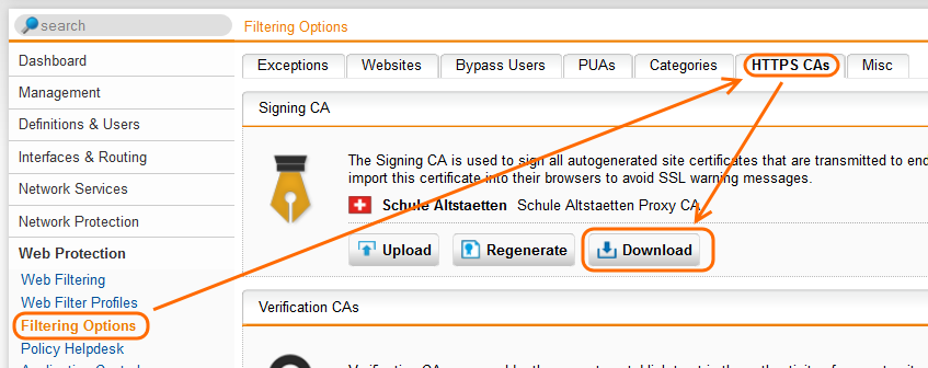 Das Zertifikat findet sich unter “Web Protection” –> “Filtering Options” –> Registerkarte “HTTPS CAs” –> “Download”.
