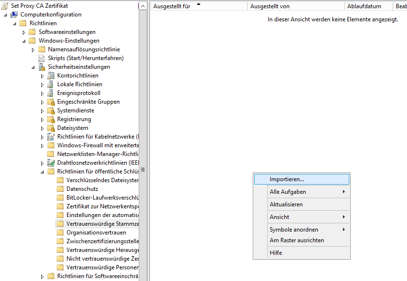 Das Zertifikat ohne privaten Schlüssel (.cer) kann nun über eine Gruppenrichtlinie auf alle Computer verteilt werden. Dazu importiert man das Zertifikat unter “Computerkonfiguration” –> “Richtlinien” –> “Windows-Einstellungen” –> “Sicherheitseinstellungen” –> “Richtlinien für öffentliche Schlüssel” –> “Vertrauenswürdige Stammzertifizierungsstellen”.
