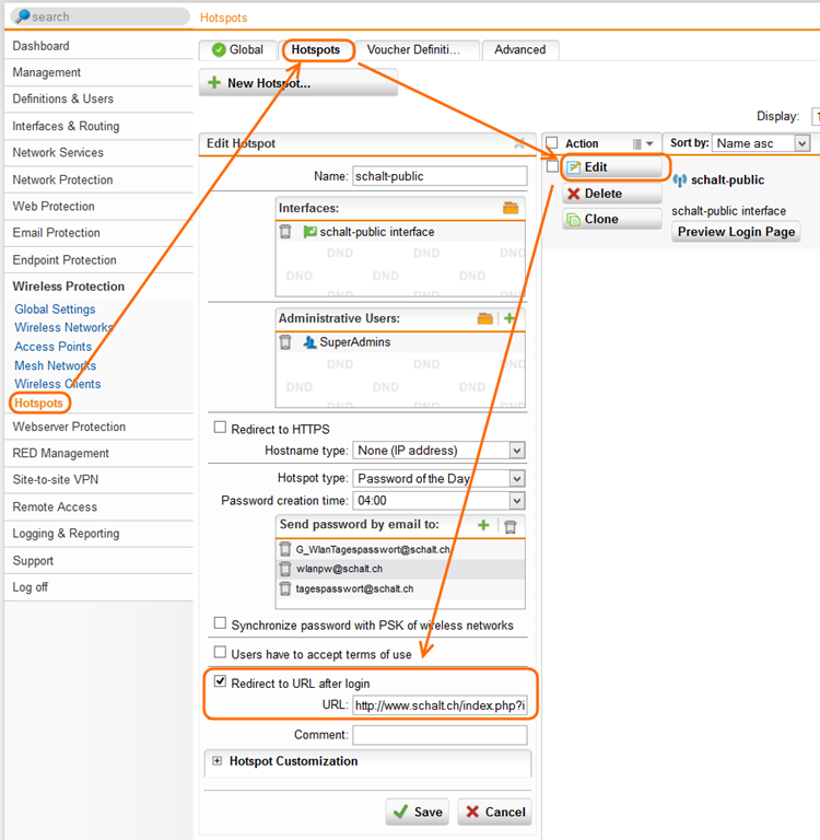 Da diese Seite nicht einfach zu merken ist, habe ich sie auf unserer Homepage verlinkt. Ausserdem habe ich den Hotspot so angepasst, dass man nach erfolgreicher Eingabe des Tagespassworts direkt auf diese Seite weitergeleitet wird.
