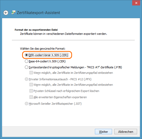 Das Zertifikat, das unter http://passthrough.fw-notify.net/cacert.pem erreichbar ist, kann unter Android nicht installiert werden. Daher muss für Android das Zertifikat anders abgespeichert werden. Dazu kann man das importierte Zertifikat unter Windows exportieren.