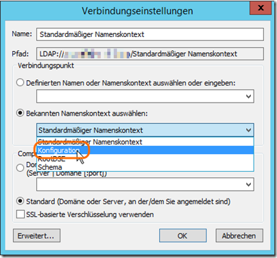 Tipp: Wenn man eine eigens erstellte Vorlage verwenden möchte (statt der Standardvorlage Computer), muss man die Schemaversion der Vorlage von 2 auf 1 ändern. Dazu kann man ADSI-Edit verwenden.