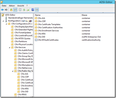 Wie man eine bestehende CA (Certificate Authority) migriert, wird auf dieser Technet Seite beschrieben. Auf dem Blog von Rachfahl findet man eine bebilderte Schritt-für-Schritt Anleitung. Dabei sollte der neue Server den gleichen Namen wie der alte haben. Ausserdem sollte der alte Server entfernt werden, bevor der neue eingesetzt wird. Wenn sich ein Problem ergeben sollte, ist der Rückweg versperrt. Auf dem Blog von Rachfahl wird die alte Zertifizierungsstelle zwar erst entfernt, nachdem die neue aufgesetzt wird, aber dies entspricht nicht dem empfohlenen Vorgehen gemäss der Technet Seite. Wenn man nach der Installation der neuen Zertifizierungsstelle die alte entfernt, könnte dies zu Problemen im Active Directory führen. Wie man die Einträge der CA im Active Directory findet, ist hier beschrieben. So habe ich mich aus diversen Überlegungen dazu entschieden, einen neuen Zertifikatserver aufzusetzen und den alten gar nicht zu migrieren.