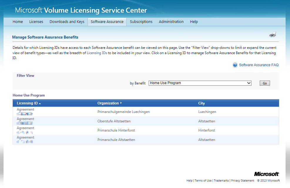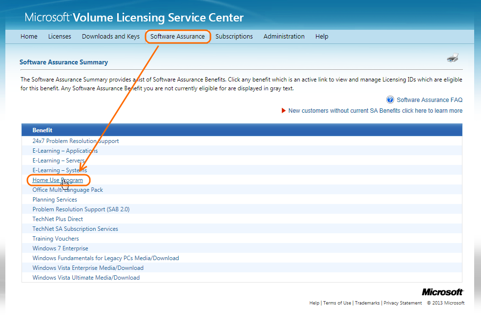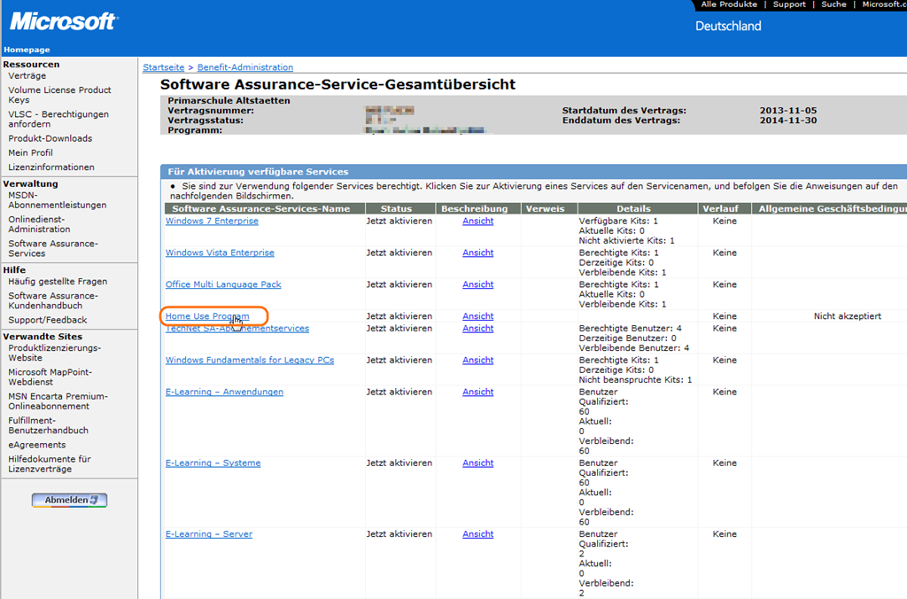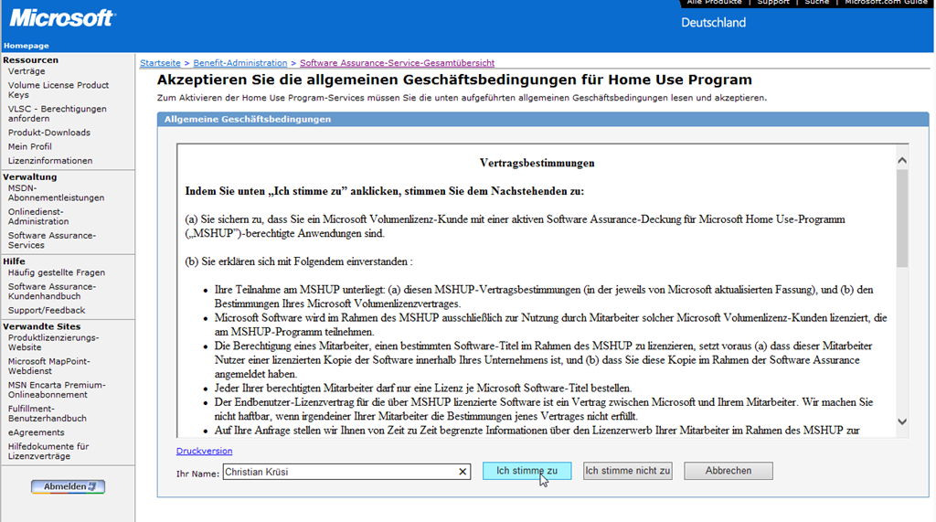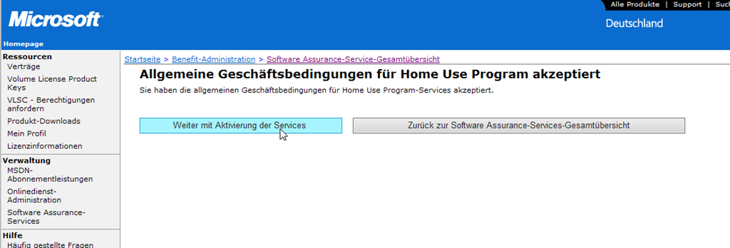 Dazu muss man auf die Seite http://www.microsoft.com/licensing/ und dort auf “Sign in to the Volume Licensing Service Center”. Nachdem man sich angemeldet hat, kann man unter “Software Assurance” “Home Use Program” auswählen