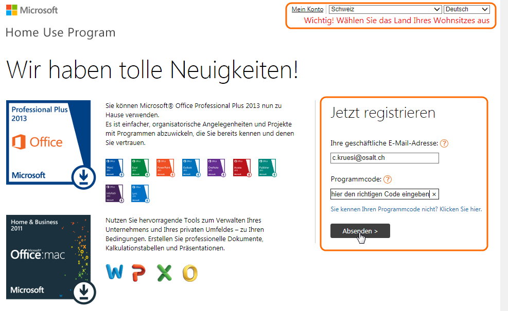 Auf der nächsten Seite muss man überprüfen, ob Schweiz und Deutsch ausgewählt ist. Bei der geschäftlichen E-Mail-Adresse muss man die Adresse der Schule verwenden. Den Programmcode erhält man von der zuständigen Person für die Schullizenzen.