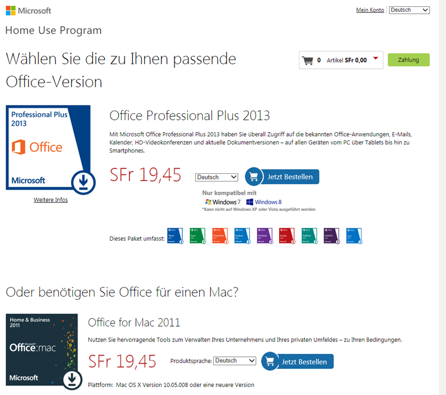 Unter Umständen sind bei einer Bestellung nicht alle Produkte und Sprachen erhältlich. Aktuelle Informationen zum Home Use Program und zu den verfügbaren Produkten finden Sie unter http://microsoft.com/licensing.