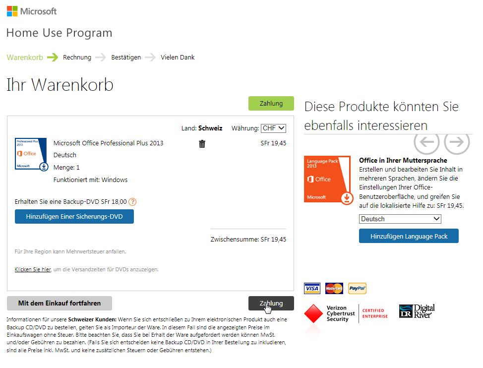 Auf der nächsten Seite kann man die Bestellung überprüfen, hier Microsoft Office Professional Plus 2013 für 19.45 Fr. Wer sich von der heruntergeladenen Datei nicht selber eine BackupDVD brennen möchte, kann sich für 18.- Fr. eine zuschicken lassen. Allenfalls kommen dann auch noch Portokosten für die DVD hinzu.