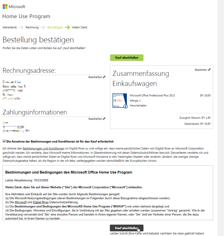 Auf der nächsten Seite kann man nochmals alles überprüfen und dann den Kauf abschliessen.