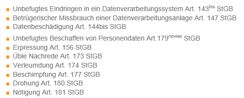 Die Schweizerische Kriminalprävention hat veröffentlicht, was die Polizei im Fall von Cybermobbing tun kann. Je nach Fall können folgende Straftatbestände erfasst werden: