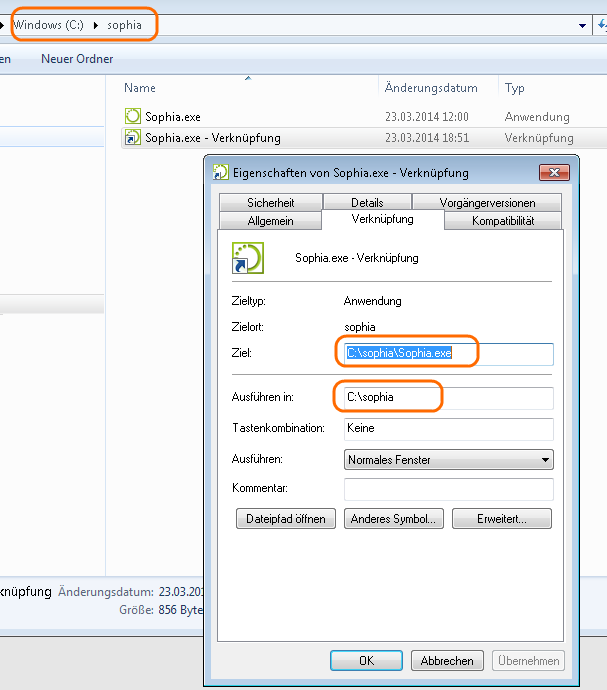 Ziel ist es also, einen Ordner c:\sophia anzulegen mit der Datei Sophia.exe darin. Ausserdem soll eine Verknüpfung im Startmenü erstellt werden.