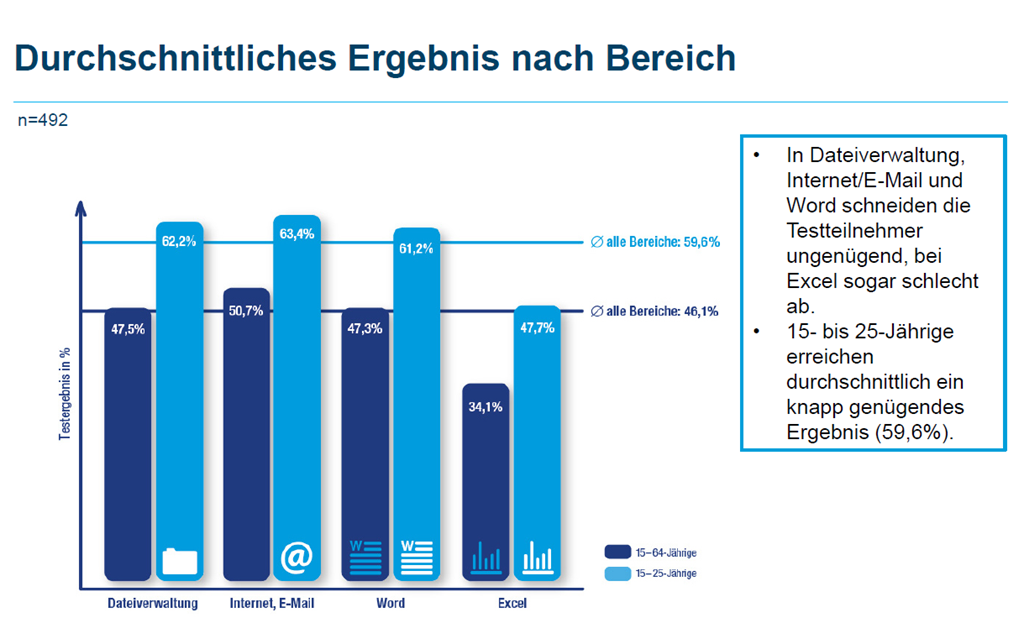 Für den Praxistest musste man 12 Aufgaben aus den Bereichen Dateiverwaltung, Internet/E-Mail, Word und Excel lösen. Im Schnitt wurden 46.1% der Aufgaben richtig gelöst, wobei die 15-25jährigen deutlich besser (59.6%) abgeschnitten haben.
